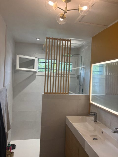 Rénovation complète de salle de bain : démolition, réaménagement et installation neuve.